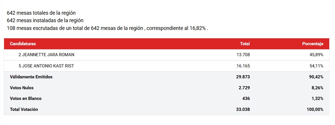 De un total de 642 mesas instaladas en la región, hasta las 19:00 horas de este domingo 14 de diciembre se han escrutado 108 mesas. En este escenario parcial, José Antonio Kast concentra el 54,11% de las preferencias, con 16.165 votos, mientras que Jeannette Jara alcanza el 45,89%, equivalente a 13.708 sufragios.